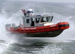 They finally made their intentions clear by increasing speed to catch up to our progress. We were going to be boarded. I was at the helm and was requested to decrease our speed to 5 kn and to continue to maintain our course. The USCG vessel came alongside us and indicated that they were going to put their boat up against mine. That didn’t seem like it would be a problem because their vessel was, basically, one of those inflatable rubber craft that shouldn’t cause any damage in a best case scenario.