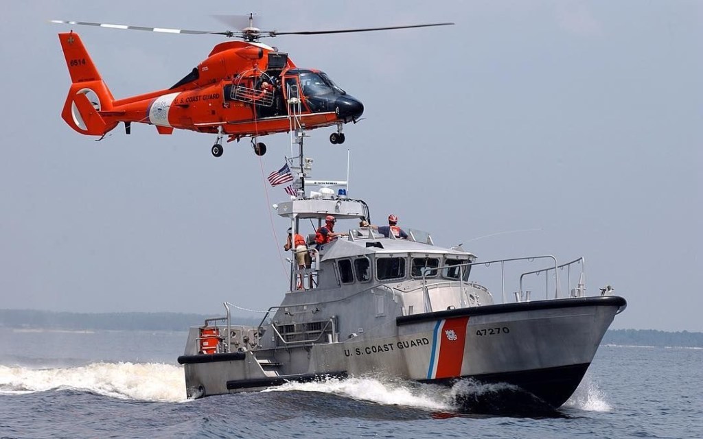 In mid December 2019, my friend Paul and I, along with two others, were headed out the gate. We were probably a half mile past the bridge on our way to the mighty Pacific Ocean when I decided to turn around to check for traffic behind that might be steaming faster than we were motoring. About 100 m behind, and to our port side, a US Coast Guard vessel, very similar to the one depicted in the photograph below, not flying across the surface of the water but instead matching our speed of about 6 kn, seemed to be tagging us. I recall they had a flashing light of some type.