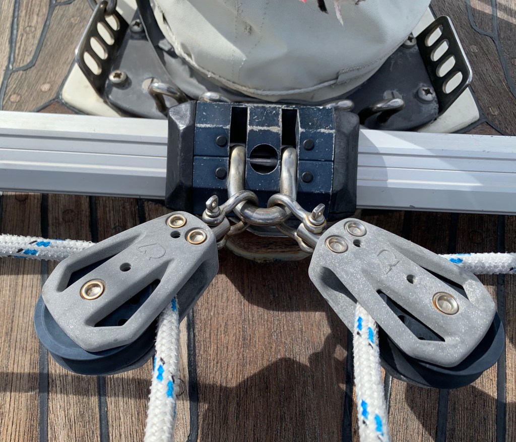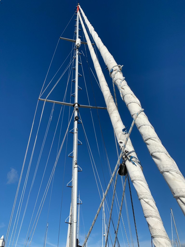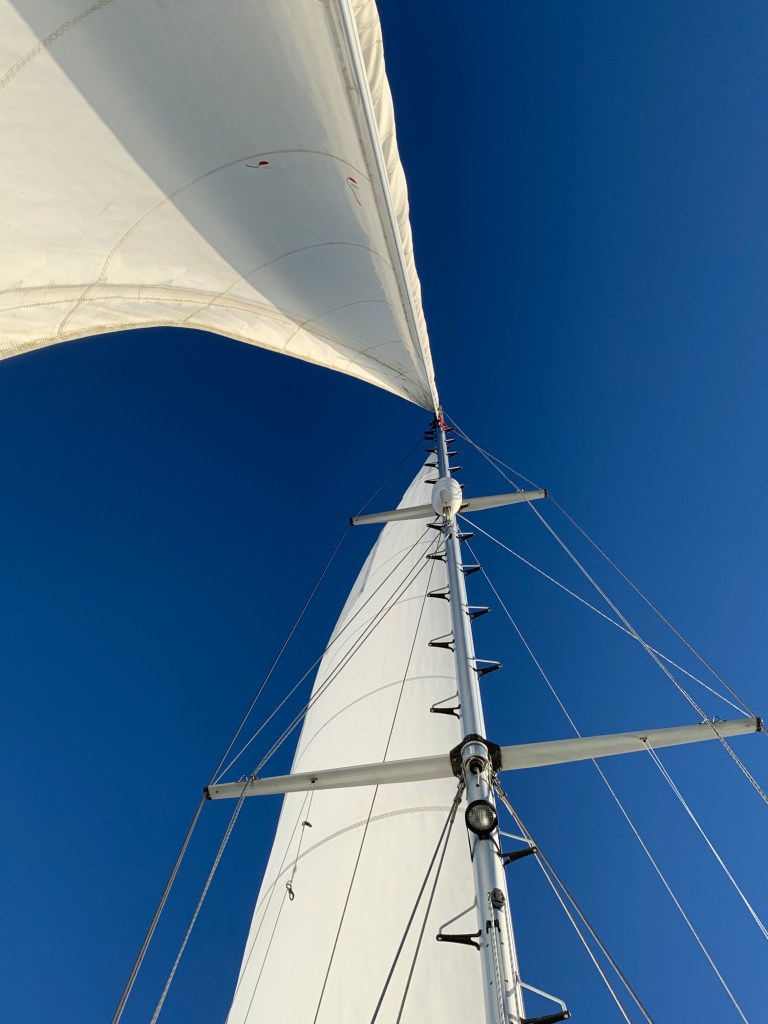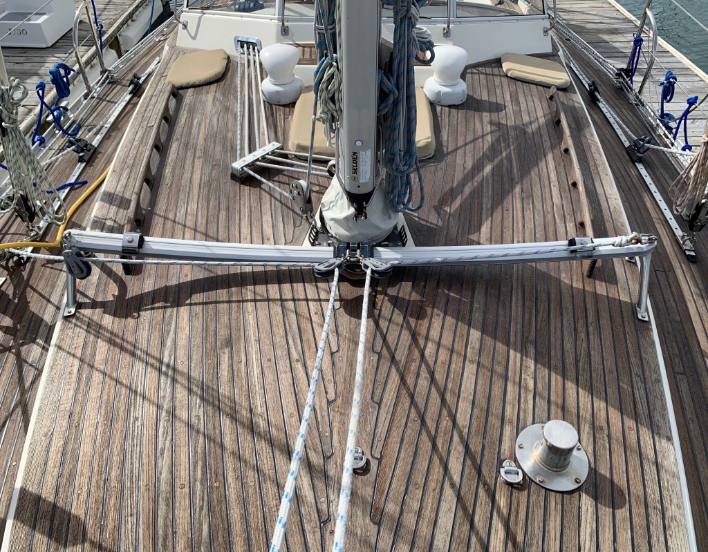Skiron happened to have a Genoa that is managed with two sheets returning to winches on either side of the boat and also a self-tacking jib. This set up intrigued me to some extent. I learned that the sail plan actually made some sense given that the vessel was a cruising sailboat. Further, the measurements of the length of the foot of the mainsail to the length of the foredeck were such that the main was driving the vessel and a smaller headsail, as is usually the case with a self-tacking jib, would be sufficient. The presence of this solent arrangement did not dissuade me from purchasing the vessel.
