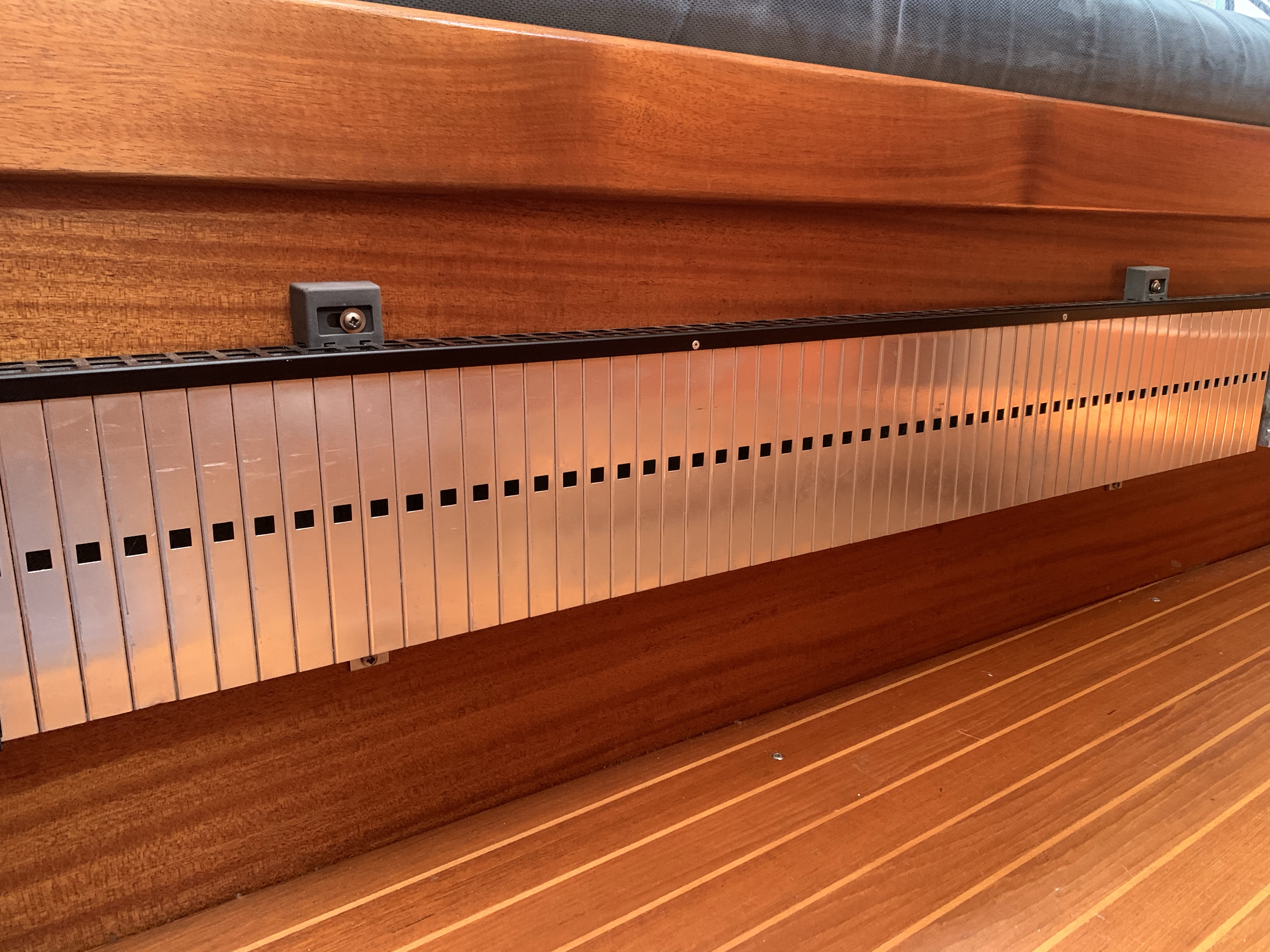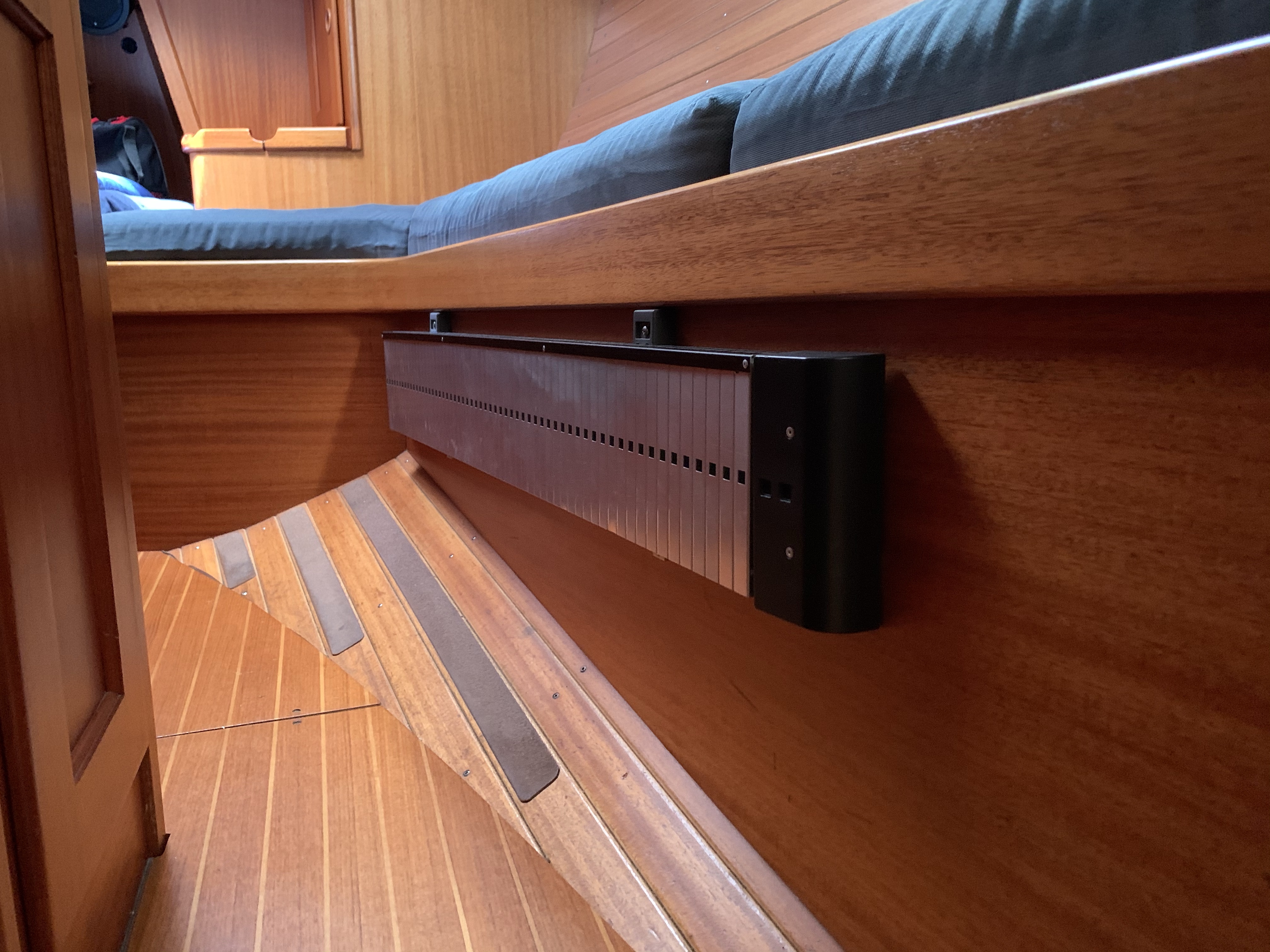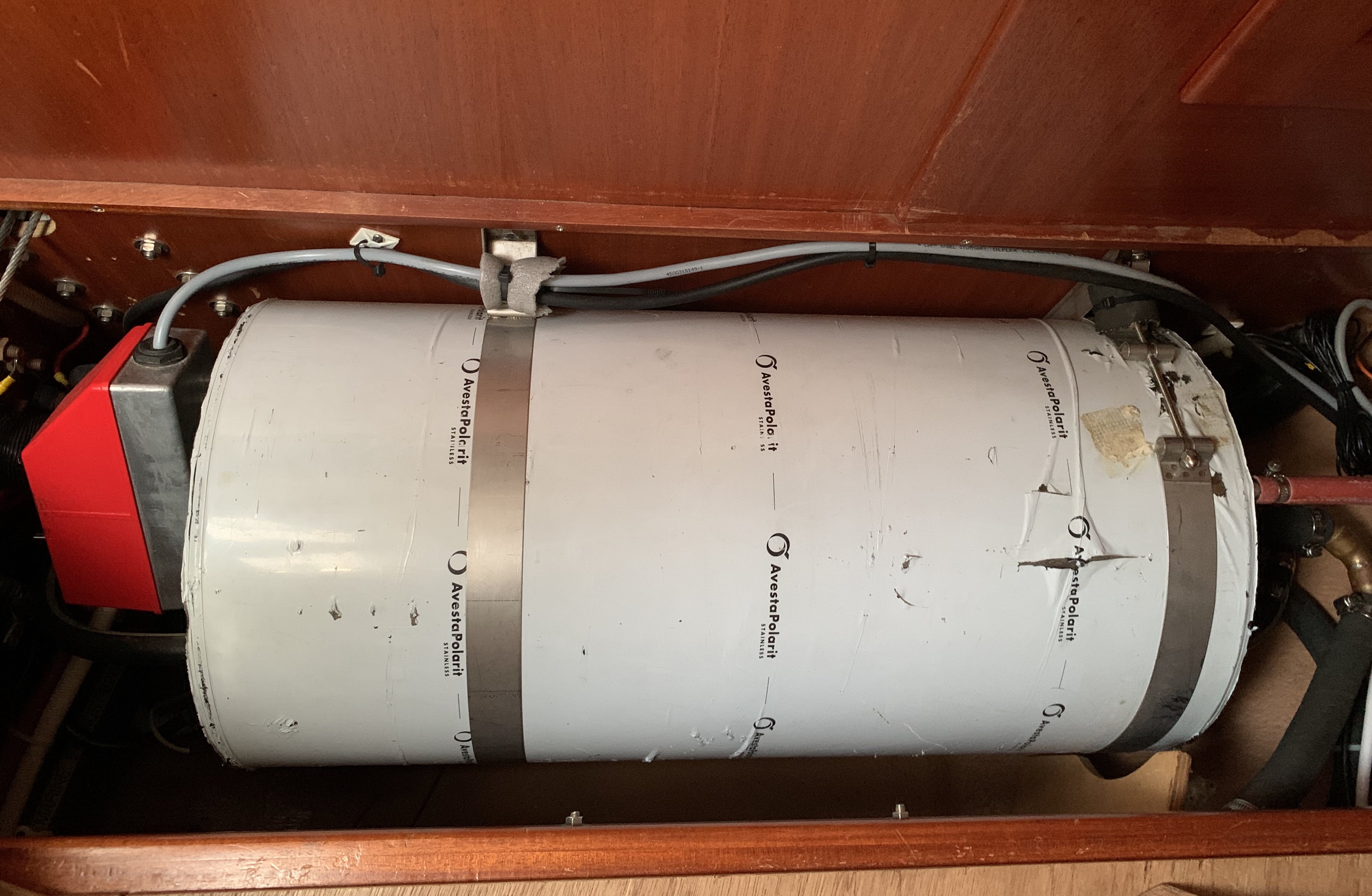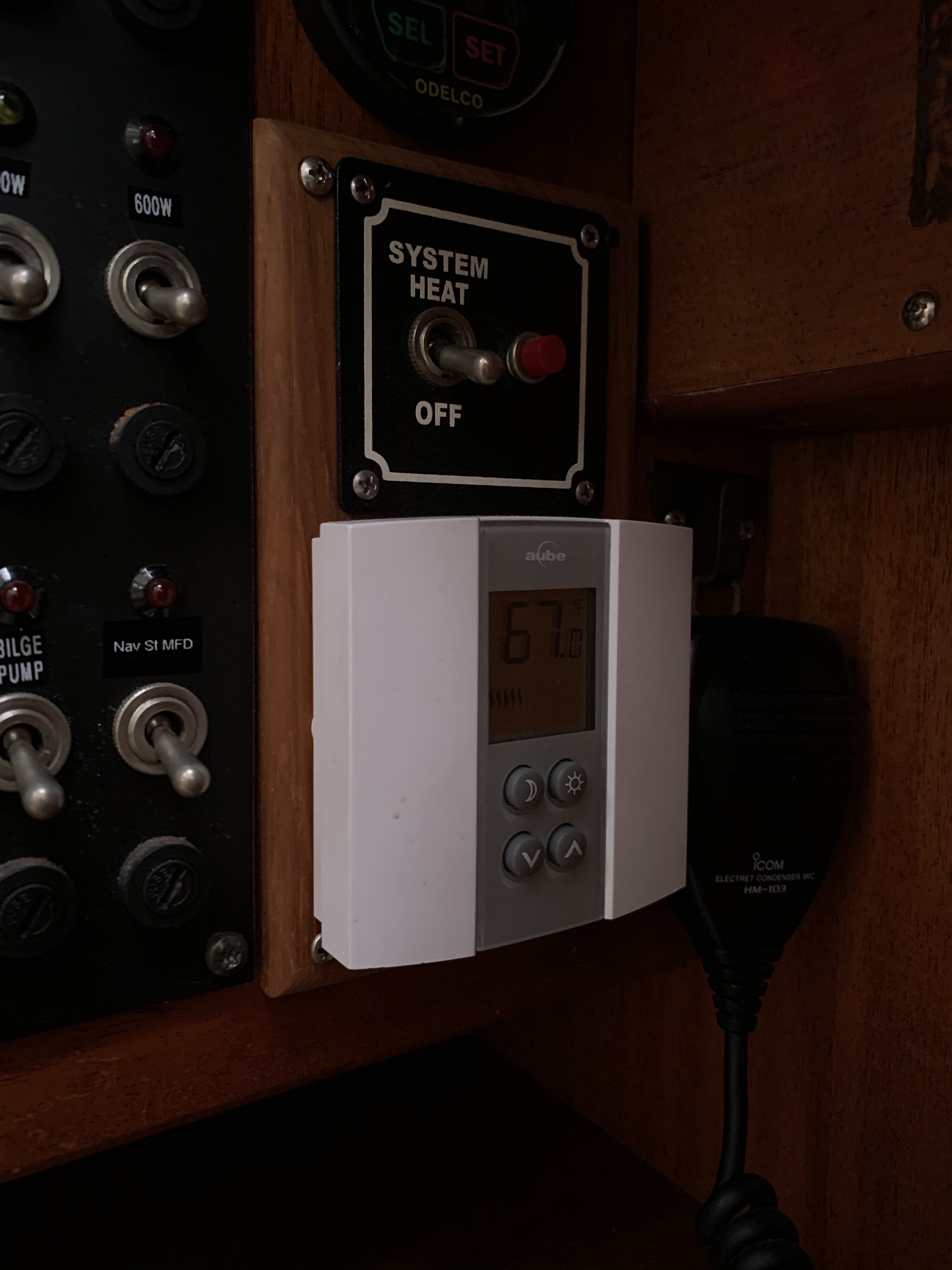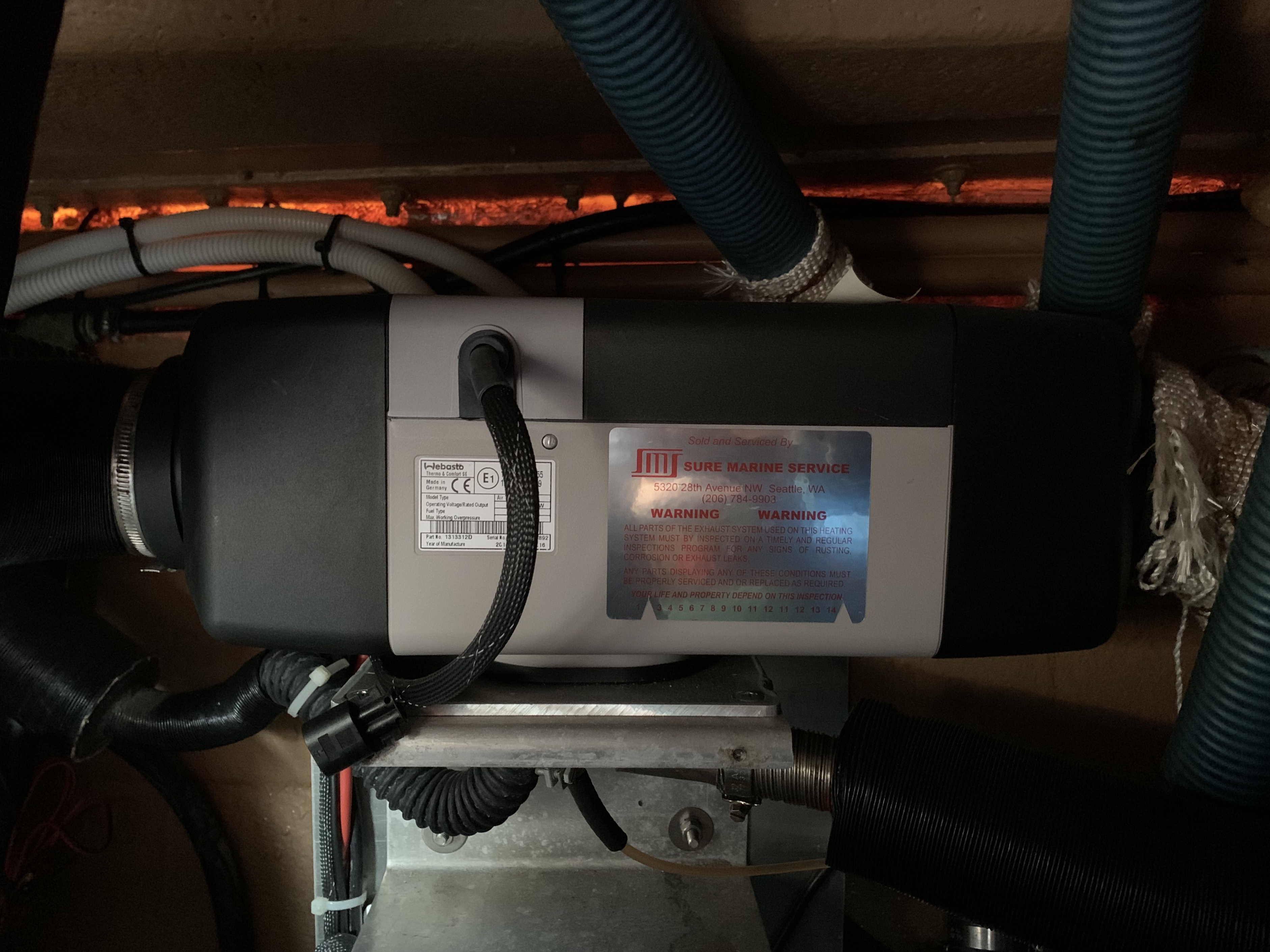 To date, the Webasto is the only heating system I’ve had to employ and then only on occasion. Our climate is moderate yet it can become rather cold on the vessel at times. I often go to the boat to read, clean, or just relax. On some winter mornings, especially when it’s under 50F I find it more comfortable to switch on the Webasto and let it do its thing. One winter morning this year, when it was 37F, within 15 min of employing the Webasto it was warm and toasty. The system uses a small amount of diesel fuel to heat air that is then blown throughout the vessel via ducts through vents into the cabin. The Webasto is regulated by a thermostat.