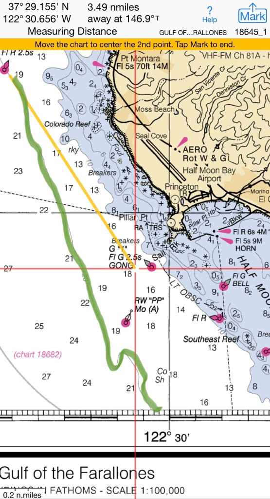 What I provided was a line much like the one below. It was constructed as an imaginary line we didn’t want to cross. I had suggested that if we maintain a course greater than about 134 M or 130C given the compass deviation on that approximate course, in that area that we should be safe and not go over the rocky shoal. If we sailed 120C, for example, we’d sail towards shore and possibly over the shoal where the waves break. In fact, the shoal is such that the break is so severe that winter swells create the waves for the Maverick’s surfing competition in this area of the chart. There are no danger signs out there so one has to craft a way to keep out of the area. Of note, our course was greater than the one indicated and my feeling was that the helmsman should not steer less than 130 or we’d head toward the shoal waters. In principle, on the chart, that seems to be a correct method to stay safe.