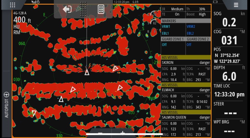 In the image above, I am the center white triangle in the Golden Gate channel. The Golden Gate Bridge is the diagonal return in the lower left corner. The Marin headlands are the irregular shaped returns to the right of the vessel. The little hook that is at 2 o’clock is point Bonita. The little orange return at 1 o’clock is the Red/Green preferred channel buoy at the start of the Bonita channel.