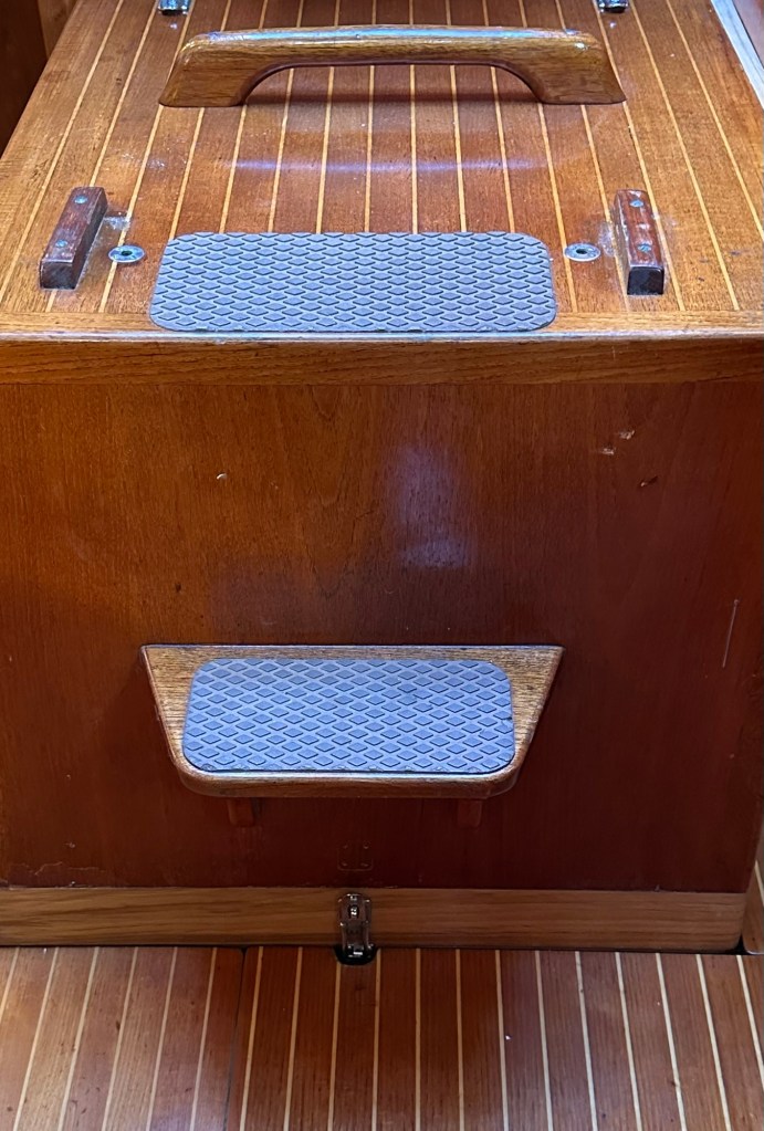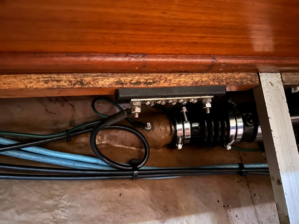 The old Perkins was shot. The bilge was filled with an inch and a half of solidified grease. That took a while to clean. They had to work out angles and clearances with the new engine and shaft as well as coupler to transmission. The team needed to close an old through hull and create a larger one since the cooling raw water intake required a larger diameter hose connection than did the Perkins. Also, they had to raise the engine box since the engine sits higher than did the Perkins.