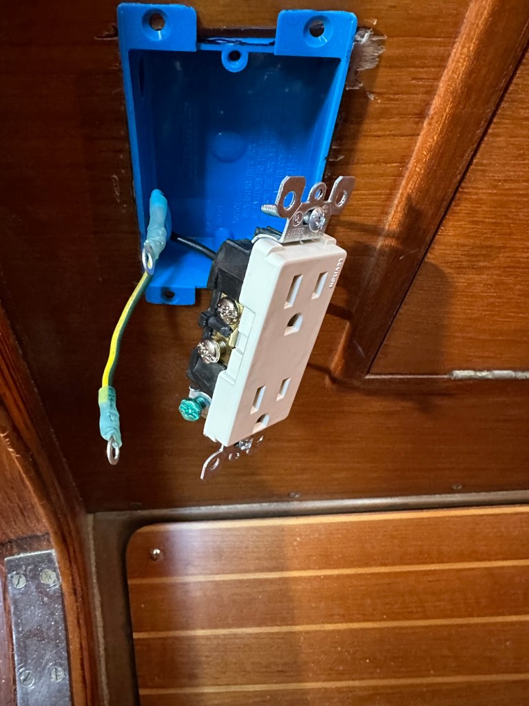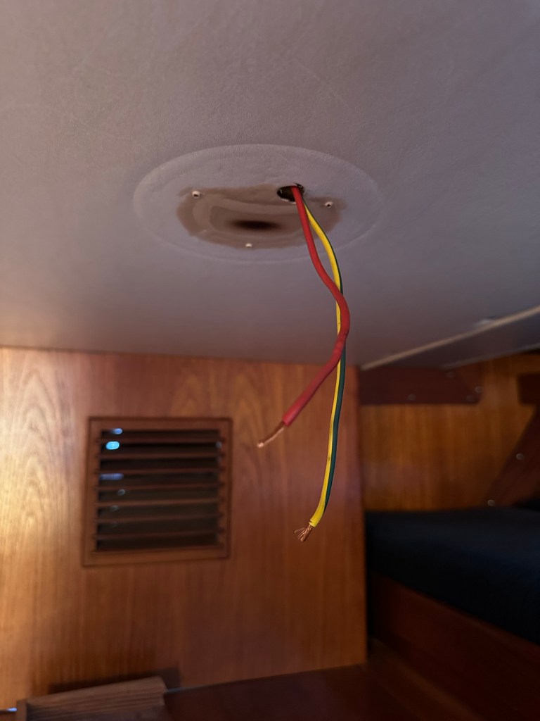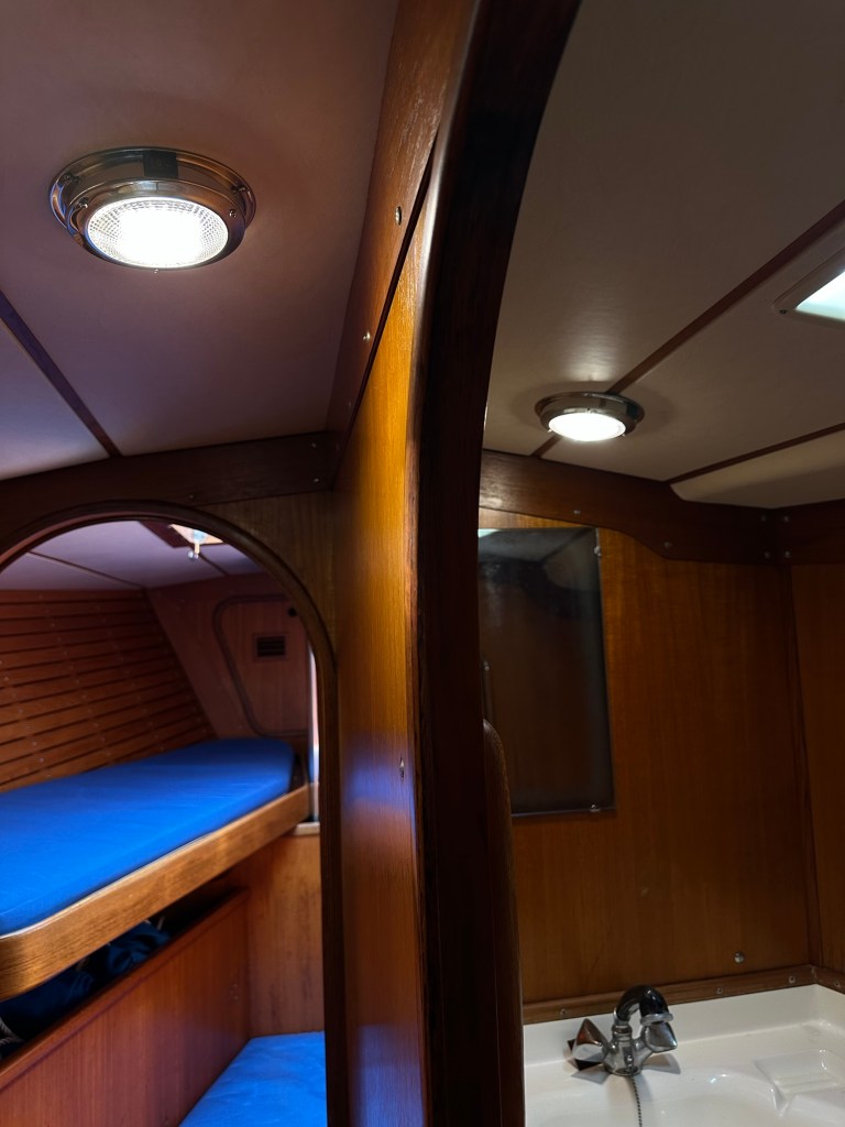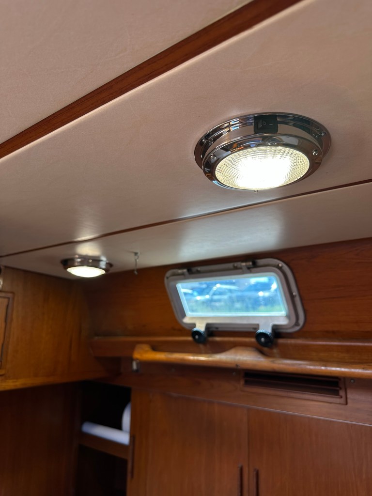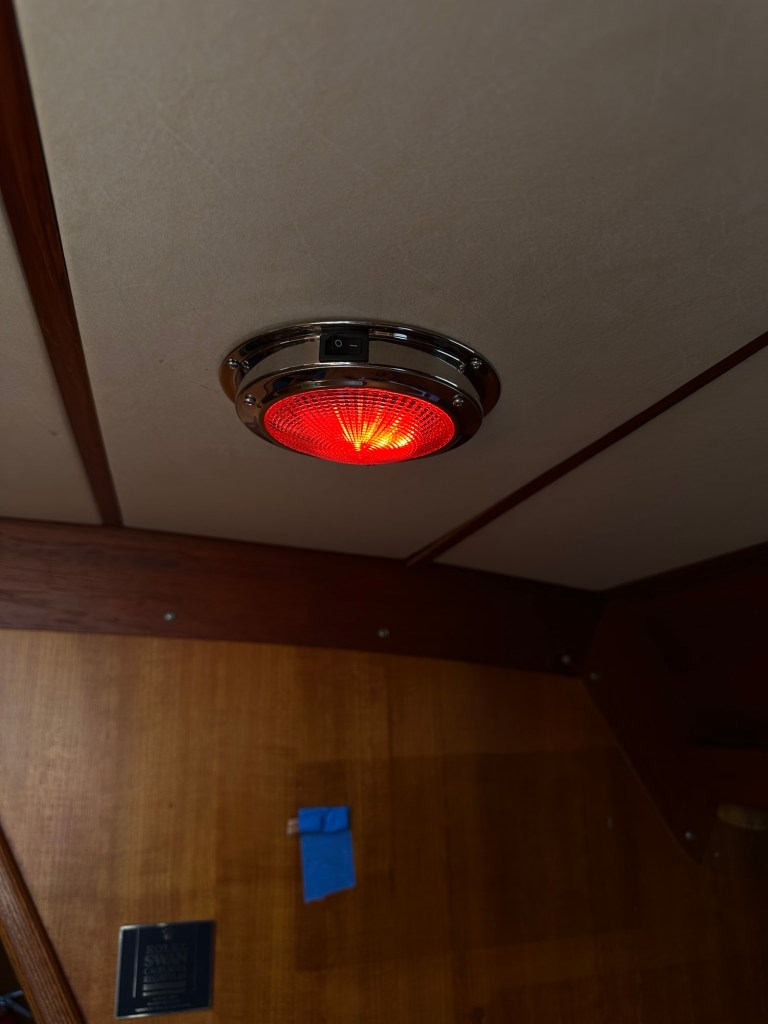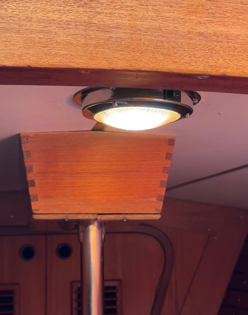 Malcolm Morgan helped me understand the wiring that had me more than confused. The new dome lights are superb warm white LED. The one over the navigation station also switches to red for night reading of charts. Maybe that’s a notion that’s a bit outdated!